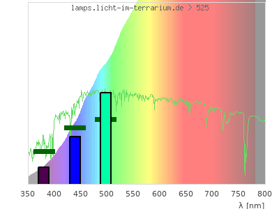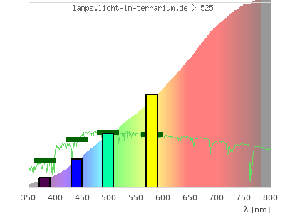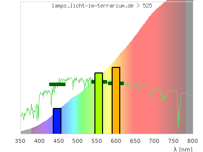 Whereas a spectrometer measures the intensity in every tiny wavelength interval resulting in thousands of individual intensities, the human eye only measures three intensities detected by the three cones. The same is true for the reptile eye with usually three or four photoreceptors. Effectively the detailled spectrum displayed above reduces to a much compacter bar graph displayed below. The photoreceptor sensitivites from these L-Cone, M-Cone, S-Cone, and U-Cone are used, they are chosen as an average of measured reptile photoreceptor sensitivity curves. The bar graph also shows as reference the intensity seen by the three or four photoreceptors for average sunlight (id 1).