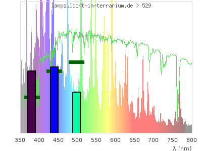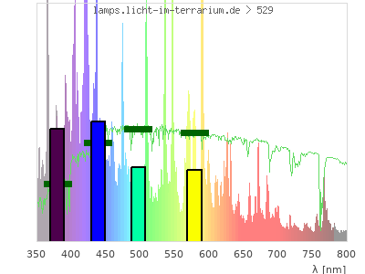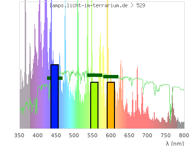 Whereas a spectrometer measures the intensity in every tiny wavelength interval resulting in thousands of individual intensities, the human eye only measures three intensities detected by the three cones. The same is true for the reptile eye with usually three or four photoreceptors. Effectively the detailled spectrum displayed above reduces to a much compacter bar graph displayed below. The photoreceptor sensitivites from these L-Cone, M-Cone, S-Cone, and U-Cone are used, they are chosen as an average of measured reptile photoreceptor sensitivity curves. The bar graph also shows as reference the intensity seen by the three or four photoreceptors for average sunlight (id 1).