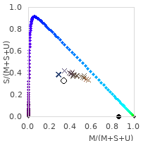 From these three numbers the colour coordinate and the correlated colour temperature for humans are calculated using the CIE standard method. I adapted this concept to a "3 cone reptile (M,S,U)" and a "4 cone reptile (L,M,S,U)". I am sure, that this adaption to other colour spaces makes sense mathematically and this is also done in scientific research regarding colour vision of animals, however I have not seen calculation of colour temperatures for other animals in the scientific literature. Even if it is hypothetical, at least this shows, how arbitrary the colour temperature is, and that the colour temperature calculated for humans does not apply to reptiles. The colour spaces also show the colour coordinates of different phases of daylight ((ids 1, 338 – 451, 511 – 513 ), indicated by crosses, coloured in the appriximate colour perceived by a human.
