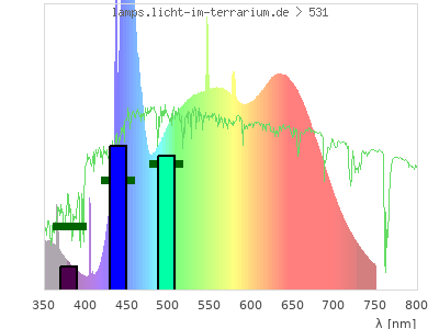 Whereas a spectrometer measures the intensity in every tiny wavelength interval resulting in thousands of individual intensities, the human eye only measures three intensities detected by the three cones. The same is true for the reptile eye with usually three or four photoreceptors. Effectively the detailled spectrum displayed above reduces to a much compacter bar graph displayed below. The photoreceptor sensitivites from these L-Cone, M-Cone, S-Cone, and U-Cone are used, they are chosen as an average of measured reptile photoreceptor sensitivity curves. The bar graph also shows as reference the intensity seen by the three or four photoreceptors for average sunlight (id 1).