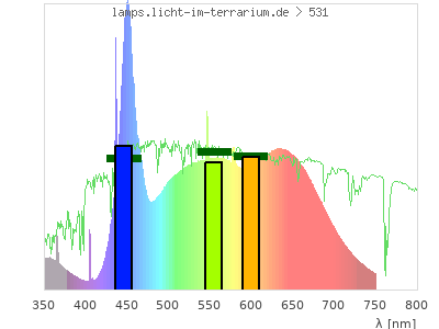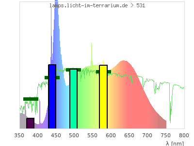 total ( 0 nm - 0 nm) 5510 µW/cm² = 55.1 W/m² UVC ( 0 nm - 280 nm) 0 µW/cm² = 0 W/m² non-terrestrial ( 0 nm - 290 nm) 0 µW/cm² = 0 W/m² total2 ( 250 nm - 880 nm) 5510 µW/cm² = 55.1 W/m² UVB (EU) ( 280 nm - 315 nm) 11.6 µW/cm² = 0.116 W/m² UVB (US) ( 280 nm - 320 nm) 18.9 µW/cm² = 0.189 W/m² UVA+B ( 280 nm - 380 nm) 249 µW/cm² = 2.49 W/m² Solar UVB ( 290 nm - 315 nm) 11.6 µW/cm² = 0.116 W/m² UVA D3 regulating ( 315 nm - 335 nm) 52.4 µW/cm² = 0.524 W/m² UVA (EU) ( 315 nm - 380 nm) 237 µW/cm² = 2.37 W/m² UVA2 (medical definition) ( 320 nm - 340 nm) 66.6 µW/cm² = 0.666 W/m² UVA (US) ( 320 nm - 380 nm) 230 µW/cm² = 2.3 W/m² UVA1 (variant) ( 335 nm - 380 nm) 185 µW/cm² = 1.85 W/m² UVA1 (medical) ( 340 nm - 400 nm) 198 µW/cm² = 1.98 W/m² vis. UVA ( 350 nm - 380 nm) 119 µW/cm² = 1.19 W/m² VIS Rep3 ( 350 nm - 600 nm) 3470 µW/cm² = 34.7 W/m² VIS Rep4 ( 350 nm - 700 nm) 5130 µW/cm² = 51.3 W/m² purple ( 380 nm - 420 nm) 79.4 µW/cm² = 0.794 W/m² VIS ( 380 nm - 780 nm) 5260 µW/cm² = 52.6 W/m² VIS2 ( 400 nm - 680 nm) 4760 µW/cm² = 47.6 W/m² PAR ( 400 nm - 700 nm) 4980 µW/cm² = 49.8 W/m² tmp ( 400 nm - 1100 nm) 5220 µW/cm² = 52.2 W/m² blue ( 420 nm - 490 nm) 1350 µW/cm² = 13.5 W/m² green ( 490 nm - 575 nm) 1490 µW/cm² = 14.9 W/m² yellow ( 575 nm - 585 nm) 182 µW/cm² = 1.82 W/m² orange ( 585 nm - 650 nm) 1210 µW/cm² = 12.1 W/m² red ( 650 nm - 780 nm) 951 µW/cm² = 9.51 W/m² IRA ( 700 nm - 1400 nm) 242 µW/cm² = 2.42 W/m² IR2 ( 720 nm - 1100 nm) 107 µW/cm² = 1.07 W/m² IRB ( 1400 nm - 3000 nm) 0 µW/cm² = 0 W/m²