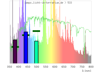 total ( 0 nm - 0 nm) 51700 µW/cm² = 517 W/m² UVC ( 0 nm - 280 nm) 0 µW/cm² = 0 W/m² non-terrestrial ( 0 nm - 290 nm) 0 µW/cm² = 0 W/m² total2 ( 250 nm - 880 nm) 51700 µW/cm² = 517 W/m² UVB (EU) ( 280 nm - 315 nm) 20.8 µW/cm² = 0.208 W/m² UVB (US) ( 280 nm - 320 nm) 30.9 µW/cm² = 0.309 W/m² UVA+B ( 280 nm - 380 nm) 3460 µW/cm² = 34.6 W/m² Solar UVB ( 290 nm - 315 nm) 20.8 µW/cm² = 0.208 W/m² UVA D3 regulating ( 315 nm - 335 nm) 120 µW/cm² = 1.2 W/m² UVA (EU) ( 315 nm - 380 nm) 3440 µW/cm² = 34.4 W/m² UVA2 (medical definition) ( 320 nm - 340 nm) 185 µW/cm² = 1.85 W/m² UVA (US) ( 320 nm - 380 nm) 3430 µW/cm² = 34.3 W/m² UVA1 (variant) ( 335 nm - 380 nm) 3320 µW/cm² = 33.2 W/m² UVA1 (medical) ( 340 nm - 400 nm) 4980 µW/cm² = 49.8 W/m² vis. UVA ( 350 nm - 380 nm) 3000 µW/cm² = 30 W/m² VIS Rep3 ( 350 nm - 600 nm) 33400 µW/cm² = 334 W/m² VIS Rep4 ( 350 nm - 700 nm) 43100 µW/cm² = 431 W/m² purple ( 380 nm - 420 nm) 4690 µW/cm² = 46.9 W/m² VIS ( 380 nm - 780 nm) 43300 µW/cm² = 433 W/m² VIS2 ( 400 nm - 680 nm) 36800 µW/cm² = 368 W/m² PAR ( 400 nm - 700 nm) 38400 µW/cm² = 384 W/m² tmp ( 400 nm - 1100 nm) 46500 µW/cm² = 465 W/m² blue ( 420 nm - 490 nm) 8870 µW/cm² = 88.7 W/m² green ( 490 nm - 575 nm) 10900 µW/cm² = 109 W/m² yellow ( 575 nm - 585 nm) 1900 µW/cm² = 19 W/m² orange ( 585 nm - 650 nm) 9560 µW/cm² = 95.6 W/m² red ( 650 nm - 780 nm) 7400 µW/cm² = 74 W/m² IRA ( 700 nm - 1400 nm) 8150 µW/cm² = 81.5 W/m² IR2 ( 720 nm - 1100 nm) 7230 µW/cm² = 72.3 W/m² IRB ( 1400 nm - 3000 nm) 0 µW/cm² = 0 W/m²