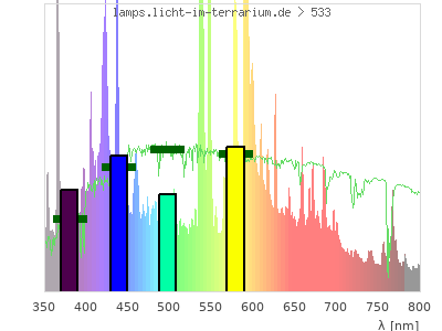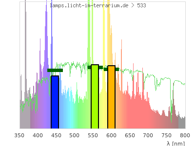 Whereas a spectrometer measures the intensity in every tiny wavelength interval resulting in thousands of individual intensities, the human eye only measures three intensities detected by the three cones. The same is true for the reptile eye with usually three or four photoreceptors. Effectively the detailled spectrum displayed above reduces to a much compacter bar graph displayed below. The photoreceptor sensitivites from these L-Cone, M-Cone, S-Cone, and U-Cone are used, they are chosen as an average of measured reptile photoreceptor sensitivity curves. The bar graph also shows as reference the intensity seen by the three or four photoreceptors for average sunlight (id 1).