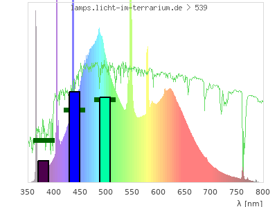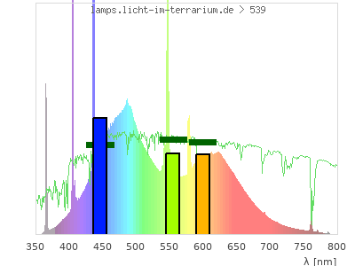 total ( 0 nm - 0 nm) 899 µW/cm² = 8.99 W/m² UVC ( 0 nm - 280 nm) 0 µW/cm² = 0 W/m² non-terrestrial ( 0 nm - 290 nm) 0 µW/cm² = 0 W/m² total2 ( 250 nm - 880 nm) 899 µW/cm² = 8.99 W/m² UVB (EU) ( 280 nm - 315 nm) 1.73 µW/cm² = 0.0173 W/m² UVB (US) ( 280 nm - 320 nm) 1.73 µW/cm² = 0.0173 W/m² UVA+B ( 280 nm - 380 nm) 13.5 µW/cm² = 0.135 W/m² Solar UVB ( 290 nm - 315 nm) 1.73 µW/cm² = 0.0173 W/m² UVA D3 regulating ( 315 nm - 335 nm) 0.202 µW/cm² = 0.00202 W/m² UVA (EU) ( 315 nm - 380 nm) 11.8 µW/cm² = 0.118 W/m² UVA2 (medical definition) ( 320 nm - 340 nm) 0.201 µW/cm² = 0.00201 W/m² UVA (US) ( 320 nm - 380 nm) 11.8 µW/cm² = 0.118 W/m² UVA1 (variant) ( 335 nm - 380 nm) 11.6 µW/cm² = 0.116 W/m² UVA1 (medical) ( 340 nm - 400 nm) 21.8 µW/cm² = 0.218 W/m² vis. UVA ( 350 nm - 380 nm) 11.6 µW/cm² = 0.116 W/m² VIS Rep3 ( 350 nm - 600 nm) 690 µW/cm² = 6.9 W/m² VIS Rep4 ( 350 nm - 700 nm) 878 µW/cm² = 8.78 W/m² purple ( 380 nm - 420 nm) 53.9 µW/cm² = 0.539 W/m² VIS ( 380 nm - 780 nm) 885 µW/cm² = 8.85 W/m² VIS2 ( 400 nm - 680 nm) 842 µW/cm² = 8.42 W/m² PAR ( 400 nm - 700 nm) 856 µW/cm² = 8.56 W/m² tmp ( 400 nm - 1100 nm) 875 µW/cm² = 8.75 W/m² blue ( 420 nm - 490 nm) 296 µW/cm² = 2.96 W/m² green ( 490 nm - 575 nm) 262 µW/cm² = 2.62 W/m² yellow ( 575 nm - 585 nm) 29 µW/cm² = 0.29 W/m² orange ( 585 nm - 650 nm) 168 µW/cm² = 1.68 W/m² red ( 650 nm - 780 nm) 75.9 µW/cm² = 0.759 W/m² IRA ( 700 nm - 1400 nm) 18.6 µW/cm² = 0.186 W/m² IR2 ( 720 nm - 1100 nm) 10.4 µW/cm² = 0.104 W/m² IRB ( 1400 nm - 3000 nm) 0 µW/cm² = 0 W/m²