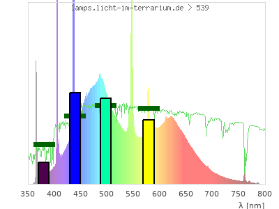 Whereas a spectrometer measures the intensity in every tiny wavelength interval resulting in thousands of individual intensities, the human eye only measures three intensities detected by the three cones. The same is true for the reptile eye with usually three or four photoreceptors. Effectively the detailled spectrum displayed above reduces to a much compacter bar graph displayed below. The photoreceptor sensitivites from these L-Cone, M-Cone, S-Cone, and U-Cone are used, they are chosen as an average of measured reptile photoreceptor sensitivity curves. The bar graph also shows as reference the intensity seen by the three or four photoreceptors for average sunlight (id 1).