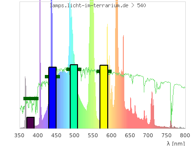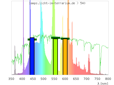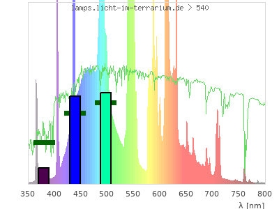 total ( 0 nm - 0 nm) 1120 µW/cm² = 11.2 W/m² UVC ( 0 nm - 280 nm) 0 µW/cm² = 0 W/m² non-terrestrial ( 0 nm - 290 nm) 0 µW/cm² = 0 W/m² total2 ( 250 nm - 880 nm) 1120 µW/cm² = 11.2 W/m² UVB (EU) ( 280 nm - 315 nm) 2.48 µW/cm² = 0.0248 W/m² UVB (US) ( 280 nm - 320 nm) 2.88 µW/cm² = 0.0288 W/m² UVA+B ( 280 nm - 380 nm) 17.8 µW/cm² = 0.178 W/m² Solar UVB ( 290 nm - 315 nm) 2.48 µW/cm² = 0.0248 W/m² UVA D3 regulating ( 315 nm - 335 nm) 1.57 µW/cm² = 0.0157 W/m² UVA (EU) ( 315 nm - 380 nm) 15.3 µW/cm² = 0.153 W/m² UVA2 (medical definition) ( 320 nm - 340 nm) 1.55 µW/cm² = 0.0155 W/m² UVA (US) ( 320 nm - 380 nm) 14.9 µW/cm² = 0.149 W/m² UVA1 (variant) ( 335 nm - 380 nm) 13.7 µW/cm² = 0.137 W/m² UVA1 (medical) ( 340 nm - 400 nm) 17.1 µW/cm² = 0.171 W/m² vis. UVA ( 350 nm - 380 nm) 12.9 µW/cm² = 0.129 W/m² VIS Rep3 ( 350 nm - 600 nm) 806 µW/cm² = 8.06 W/m² VIS Rep4 ( 350 nm - 700 nm) 1080 µW/cm² = 10.8 W/m² purple ( 380 nm - 420 nm) 38.5 µW/cm² = 0.385 W/m² VIS ( 380 nm - 780 nm) 1100 µW/cm² = 11 W/m² VIS2 ( 400 nm - 680 nm) 1050 µW/cm² = 10.5 W/m² PAR ( 400 nm - 700 nm) 1070 µW/cm² = 10.7 W/m² tmp ( 400 nm - 1100 nm) 1090 µW/cm² = 10.9 W/m² blue ( 420 nm - 490 nm) 321 µW/cm² = 3.21 W/m² green ( 490 nm - 575 nm) 350 µW/cm² = 3.5 W/m² yellow ( 575 nm - 585 nm) 27.8 µW/cm² = 0.278 W/m² orange ( 585 nm - 650 nm) 291 µW/cm² = 2.91 W/m² red ( 650 nm - 780 nm) 68.3 µW/cm² = 0.683 W/m² IRA ( 700 nm - 1400 nm) 27.1 µW/cm² = 0.271 W/m² IR2 ( 720 nm - 1100 nm) 9.11 µW/cm² = 0.0911 W/m² IRB ( 1400 nm - 3000 nm) 0 µW/cm² = 0 W/m²