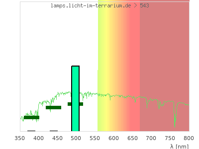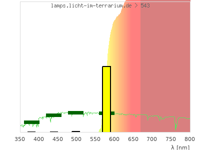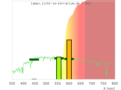 Whereas a spectrometer measures the intensity in every tiny wavelength interval resulting in thousands of individual intensities, the human eye only measures three intensities detected by the three cones. The same is true for the reptile eye with usually three or four photoreceptors. Effectively the detailled spectrum displayed above reduces to a much compacter bar graph displayed below. The photoreceptor sensitivites from these L-Cone, M-Cone, S-Cone, and U-Cone are used, they are chosen as an average of measured reptile photoreceptor sensitivity curves. The bar graph also shows as reference the intensity seen by the three or four photoreceptors for average sunlight (id 1).