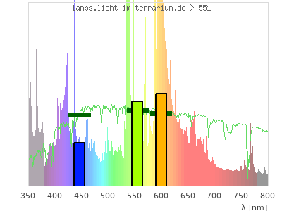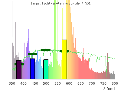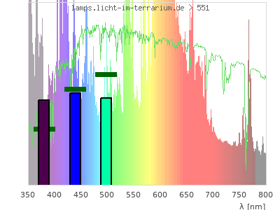 Whereas a spectrometer measures the intensity in every tiny wavelength interval resulting in thousands of individual intensities, the human eye only measures three intensities detected by the three cones. The same is true for the reptile eye with usually three or four photoreceptors. Effectively the detailled spectrum displayed above reduces to a much compacter bar graph displayed below. The photoreceptor sensitivites from these L-Cone, M-Cone, S-Cone, and U-Cone are used, they are chosen as an average of measured reptile photoreceptor sensitivity curves. The bar graph also shows as reference the intensity seen by the three or four photoreceptors for average sunlight (id 1).