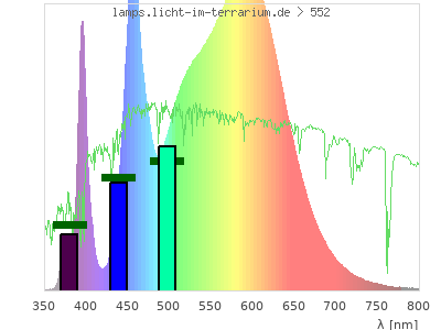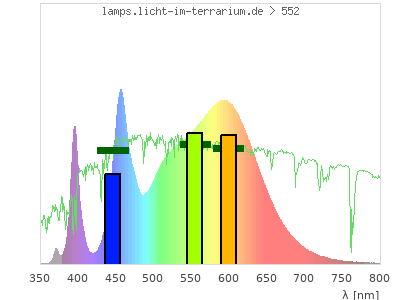 Whereas a spectrometer measures the intensity in every tiny wavelength interval resulting in thousands of individual intensities, the human eye only measures three intensities detected by the three cones. The same is true for the reptile eye with usually three or four photoreceptors. Effectively the detailled spectrum displayed above reduces to a much compacter bar graph displayed below. The photoreceptor sensitivites from these L-Cone, M-Cone, S-Cone, and U-Cone are used, they are chosen as an average of measured reptile photoreceptor sensitivity curves. The bar graph also shows as reference the intensity seen by the three or four photoreceptors for average sunlight (id 1).
