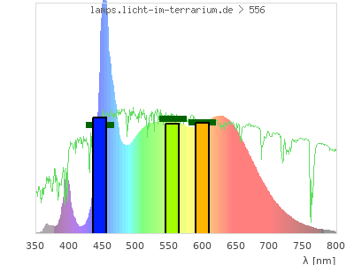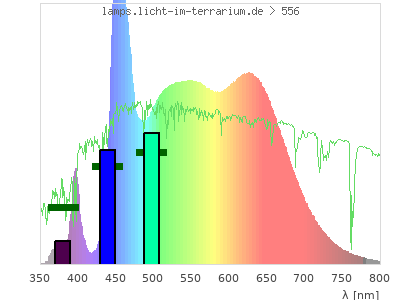 total ( 0 nm - 0 nm) 59600 µW/cm² = 596 W/m² UVC ( 0 nm - 280 nm) 0 µW/cm² = 0 W/m² non-terrestrial ( 0 nm - 290 nm) 0 µW/cm² = 0 W/m² total2 ( 250 nm - 880 nm) 59600 µW/cm² = 596 W/m² UVB (EU) ( 280 nm - 315 nm) 0 µW/cm² = 0 W/m² UVB (US) ( 280 nm - 320 nm) 0 µW/cm² = 0 W/m² UVA+B ( 280 nm - 380 nm) 324 µW/cm² = 3.24 W/m² Solar UVB ( 290 nm - 315 nm) 0 µW/cm² = 0 W/m² UVA D3 regulating ( 315 nm - 335 nm) 8.67 µW/cm² = 0.0867 W/m² UVA (EU) ( 315 nm - 380 nm) 324 µW/cm² = 3.24 W/m² UVA2 (medical definition) ( 320 nm - 340 nm) 12.7 µW/cm² = 0.127 W/m² UVA (US) ( 320 nm - 380 nm) 324 µW/cm² = 3.24 W/m² UVA1 (variant) ( 335 nm - 380 nm) 315 µW/cm² = 3.15 W/m² UVA1 (medical) ( 340 nm - 400 nm) 1530 µW/cm² = 15.3 W/m² vis. UVA ( 350 nm - 380 nm) 306 µW/cm² = 3.06 W/m² VIS Rep3 ( 350 nm - 600 nm) 39500 µW/cm² = 395 W/m² VIS Rep4 ( 350 nm - 700 nm) 57100 µW/cm² = 571 W/m² purple ( 380 nm - 420 nm) 1830 µW/cm² = 18.3 W/m² VIS ( 380 nm - 780 nm) 59200 µW/cm² = 592 W/m² VIS2 ( 400 nm - 680 nm) 53600 µW/cm² = 536 W/m² PAR ( 400 nm - 700 nm) 55600 µW/cm² = 556 W/m² tmp ( 400 nm - 1100 nm) 58100 µW/cm² = 581 W/m² blue ( 420 nm - 490 nm) 14800 µW/cm² = 148 W/m² green ( 490 nm - 575 nm) 17400 µW/cm² = 174 W/m² yellow ( 575 nm - 585 nm) 2020 µW/cm² = 20.2 W/m² orange ( 585 nm - 650 nm) 13900 µW/cm² = 139 W/m² red ( 650 nm - 780 nm) 9170 µW/cm² = 91.7 W/m² IRA ( 700 nm - 1400 nm) 2480 µW/cm² = 24.8 W/m² IR2 ( 720 nm - 1100 nm) 1310 µW/cm² = 13.1 W/m² IRB ( 1400 nm - 3000 nm) 0 µW/cm² = 0 W/m²