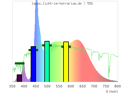 Whereas a spectrometer measures the intensity in every tiny wavelength interval resulting in thousands of individual intensities, the human eye only measures three intensities detected by the three cones. The same is true for the reptile eye with usually three or four photoreceptors. Effectively the detailled spectrum displayed above reduces to a much compacter bar graph displayed below. The photoreceptor sensitivites from these L-Cone, M-Cone, S-Cone, and U-Cone are used, they are chosen as an average of measured reptile photoreceptor sensitivity curves. The bar graph also shows as reference the intensity seen by the three or four photoreceptors for average sunlight (id 1).