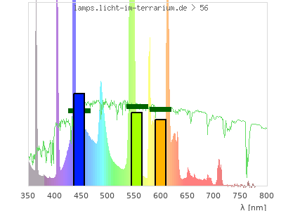 total ( 0 nm - 0 nm) 967 µW/cm² = 9.67 W/m² UVC ( 0 nm - 280 nm) 0.796 µW/cm² = 0.00796 W/m² non-terrestrial ( 0 nm - 290 nm) 15.5 µW/cm² = 0.155 W/m² total2 ( 250 nm - 880 nm) 967 µW/cm² = 9.67 W/m² UVB (EU) ( 280 nm - 315 nm) 210 µW/cm² = 2.1 W/m² UVB (US) ( 280 nm - 320 nm) 246 µW/cm² = 2.46 W/m² UVA+B ( 280 nm - 380 nm) 355 µW/cm² = 3.55 W/m² Solar UVB ( 290 nm - 315 nm) 196 µW/cm² = 1.96 W/m² UVA D3 regulating ( 315 nm - 335 nm) 95.1 µW/cm² = 0.951 W/m² UVA (EU) ( 315 nm - 380 nm) 145 µW/cm² = 1.45 W/m² UVA2 (medical definition) ( 320 nm - 340 nm) 69.1 µW/cm² = 0.691 W/m² UVA (US) ( 320 nm - 380 nm) 109 µW/cm² = 1.09 W/m² UVA1 (variant) ( 335 nm - 380 nm) 49.8 µW/cm² = 0.498 W/m² UVA1 (medical) ( 340 nm - 400 nm) 45.5 µW/cm² = 0.455 W/m² vis. UVA ( 350 nm - 380 nm) 28.7 µW/cm² = 0.287 W/m² VIS Rep3 ( 350 nm - 600 nm) 543 µW/cm² = 5.43 W/m² VIS Rep4 ( 350 nm - 700 nm) 633 µW/cm² = 6.33 W/m² purple ( 380 nm - 420 nm) 46.3 µW/cm² = 0.463 W/m² VIS ( 380 nm - 780 nm) 611 µW/cm² = 6.11 W/m² VIS2 ( 400 nm - 680 nm) 595 µW/cm² = 5.95 W/m² PAR ( 400 nm - 700 nm) 599 µW/cm² = 5.99 W/m² tmp ( 400 nm - 1100 nm) 605 µW/cm² = 6.05 W/m² blue ( 420 nm - 490 nm) 213 µW/cm² = 2.13 W/m² green ( 490 nm - 575 nm) 207 µW/cm² = 2.07 W/m² yellow ( 575 nm - 585 nm) 27.3 µW/cm² = 0.273 W/m² orange ( 585 nm - 650 nm) 98 µW/cm² = 0.98 W/m² red ( 650 nm - 780 nm) 18.9 µW/cm² = 0.189 W/m² IRA ( 700 nm - 1400 nm) 6.54 µW/cm² = 0.0654 W/m² IR2 ( 720 nm - 1100 nm) 0.546 µW/cm² = 0.00546 W/m² IRB ( 1400 nm - 3000 nm) 0 µW/cm² = 0 W/m²