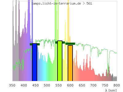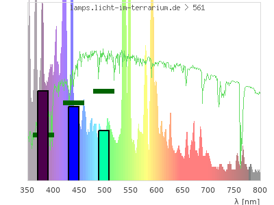 Whereas a spectrometer measures the intensity in every tiny wavelength interval resulting in thousands of individual intensities, the human eye only measures three intensities detected by the three cones. The same is true for the reptile eye with usually three or four photoreceptors. Effectively the detailled spectrum displayed above reduces to a much compacter bar graph displayed below. The photoreceptor sensitivites from these L-Cone, M-Cone, S-Cone, and U-Cone are used, they are chosen as an average of measured reptile photoreceptor sensitivity curves. The bar graph also shows as reference the intensity seen by the three or four photoreceptors for average sunlight (id 1).
