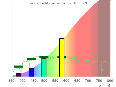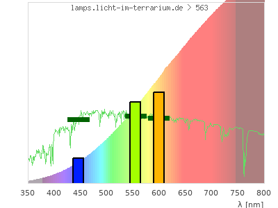 Whereas a spectrometer measures the intensity in every tiny wavelength interval resulting in thousands of individual intensities, the human eye only measures three intensities detected by the three cones. The same is true for the reptile eye with usually three or four photoreceptors. Effectively the detailled spectrum displayed above reduces to a much compacter bar graph displayed below. The photoreceptor sensitivites from these L-Cone, M-Cone, S-Cone, and U-Cone are used, they are chosen as an average of measured reptile photoreceptor sensitivity curves. The bar graph also shows as reference the intensity seen by the three or four photoreceptors for average sunlight (id 1).