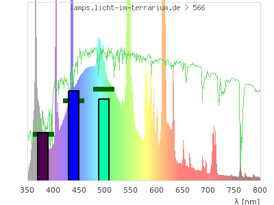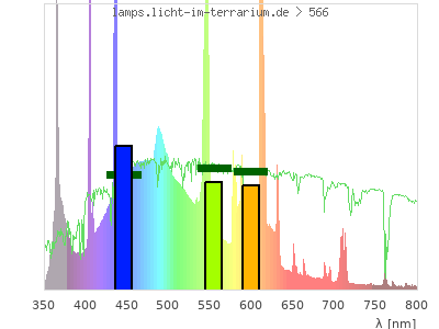 Whereas a spectrometer measures the intensity in every tiny wavelength interval resulting in thousands of individual intensities, the human eye only measures three intensities detected by the three cones. The same is true for the reptile eye with usually three or four photoreceptors. Effectively the detailled spectrum displayed above reduces to a much compacter bar graph displayed below. The photoreceptor sensitivites from these L-Cone, M-Cone, S-Cone, and U-Cone are used, they are chosen as an average of measured reptile photoreceptor sensitivity curves. The bar graph also shows as reference the intensity seen by the three or four photoreceptors for average sunlight (id 1).