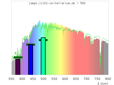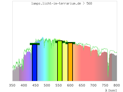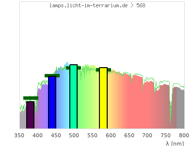 Whereas a spectrometer measures the intensity in every tiny wavelength interval resulting in thousands of individual intensities, the human eye only measures three intensities detected by the three cones. The same is true for the reptile eye with usually three or four photoreceptors. Effectively the detailled spectrum displayed above reduces to a much compacter bar graph displayed below. The photoreceptor sensitivites from these L-Cone, M-Cone, S-Cone, and U-Cone are used, they are chosen as an average of measured reptile photoreceptor sensitivity curves. The bar graph also shows as reference the intensity seen by the three or four photoreceptors for average sunlight (id 1).