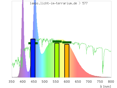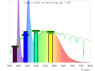 Whereas a spectrometer measures the intensity in every tiny wavelength interval resulting in thousands of individual intensities, the human eye only measures three intensities detected by the three cones. The same is true for the reptile eye with usually three or four photoreceptors. Effectively the detailled spectrum displayed above reduces to a much compacter bar graph displayed below. The photoreceptor sensitivites from these L-Cone, M-Cone, S-Cone, and U-Cone are used, they are chosen as an average of measured reptile photoreceptor sensitivity curves. The bar graph also shows as reference the intensity seen by the three or four photoreceptors for average sunlight (id 1).