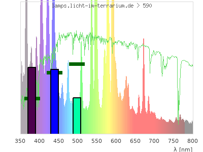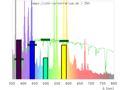 Whereas a spectrometer measures the intensity in every tiny wavelength interval resulting in thousands of individual intensities, the human eye only measures three intensities detected by the three cones. The same is true for the reptile eye with usually three or four photoreceptors. Effectively the detailled spectrum displayed above reduces to a much compacter bar graph displayed below. The photoreceptor sensitivites from these L-Cone, M-Cone, S-Cone, and U-Cone are used, they are chosen as an average of measured reptile photoreceptor sensitivity curves. The bar graph also shows as reference the intensity seen by the three or four photoreceptors for average sunlight (id 1).