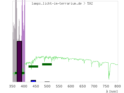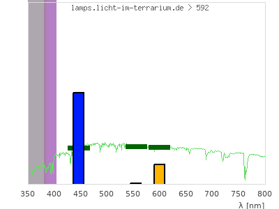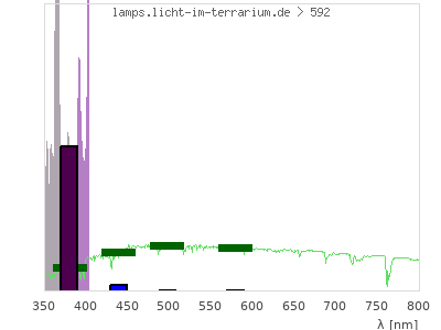 total ( 0 nm - 0 nm) 4860 µW/cm² = 48.6 W/m² UVC ( 0 nm - 280 nm) 0 µW/cm² = 0 W/m² non-terrestrial ( 0 nm - 290 nm) 0 µW/cm² = 0 W/m² total2 ( 250 nm - 880 nm) 4860 µW/cm² = 48.6 W/m² UVB (EU) ( 280 nm - 315 nm) 133 µW/cm² = 1.33 W/m² UVB (US) ( 280 nm - 320 nm) 160 µW/cm² = 1.6 W/m² UVA+B ( 280 nm - 380 nm) 3400 µW/cm² = 34 W/m² Solar UVB ( 290 nm - 315 nm) 133 µW/cm² = 1.33 W/m² UVA D3 regulating ( 315 nm - 335 nm) 215 µW/cm² = 2.15 W/m² UVA (EU) ( 315 nm - 380 nm) 3270 µW/cm² = 32.7 W/m² UVA2 (medical definition) ( 320 nm - 340 nm) 289 µW/cm² = 2.89 W/m² UVA (US) ( 320 nm - 380 nm) 3250 µW/cm² = 32.5 W/m² UVA1 (variant) ( 335 nm - 380 nm) 3060 µW/cm² = 30.6 W/m² UVA1 (medical) ( 340 nm - 400 nm) 4150 µW/cm² = 41.5 W/m² vis. UVA ( 350 nm - 380 nm) 2760 µW/cm² = 27.6 W/m² VIS Rep3 ( 350 nm - 600 nm) 4210 µW/cm² = 42.1 W/m² VIS Rep4 ( 350 nm - 700 nm) 4210 µW/cm² = 42.1 W/m² purple ( 380 nm - 420 nm) 1460 µW/cm² = 14.6 W/m² VIS ( 380 nm - 780 nm) 1460 µW/cm² = 14.6 W/m² VIS2 ( 400 nm - 680 nm) 267 µW/cm² = 2.67 W/m² PAR ( 400 nm - 700 nm) 267 µW/cm² = 2.67 W/m² tmp ( 400 nm - 1100 nm) 267 µW/cm² = 2.67 W/m² blue ( 420 nm - 490 nm) 0 µW/cm² = 0 W/m² green ( 490 nm - 575 nm) 0 µW/cm² = 0 W/m² yellow ( 575 nm - 585 nm) 0 µW/cm² = 0 W/m² orange ( 585 nm - 650 nm) 0 µW/cm² = 0 W/m² red ( 650 nm - 780 nm) 0 µW/cm² = 0 W/m² IRA ( 700 nm - 1400 nm) 0 µW/cm² = 0 W/m² IR2 ( 720 nm - 1100 nm) 0 µW/cm² = 0 W/m² IRB ( 1400 nm - 3000 nm) 0 µW/cm² = 0 W/m²