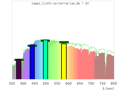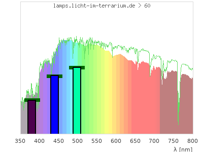 Whereas a spectrometer measures the intensity in every tiny wavelength interval resulting in thousands of individual intensities, the human eye only measures three intensities detected by the three cones. The same is true for the reptile eye with usually three or four photoreceptors. Effectively the detailled spectrum displayed above reduces to a much compacter bar graph displayed below. The photoreceptor sensitivites from these L-Cone, M-Cone, S-Cone, and U-Cone are used, they are chosen as an average of measured reptile photoreceptor sensitivity curves. The bar graph also shows as reference the intensity seen by the three or four photoreceptors for average sunlight (id 1).