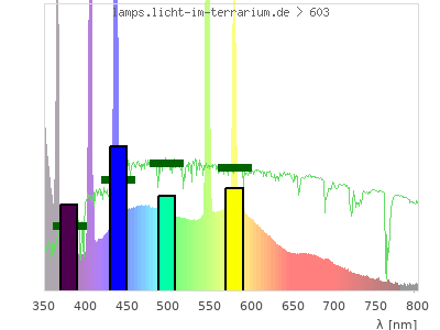 Whereas a spectrometer measures the intensity in every tiny wavelength interval resulting in thousands of individual intensities, the human eye only measures three intensities detected by the three cones. The same is true for the reptile eye with usually three or four photoreceptors. Effectively the detailled spectrum displayed above reduces to a much compacter bar graph displayed below. The photoreceptor sensitivites from these L-Cone, M-Cone, S-Cone, and U-Cone are used, they are chosen as an average of measured reptile photoreceptor sensitivity curves. The bar graph also shows as reference the intensity seen by the three or four photoreceptors for average sunlight (id 1).