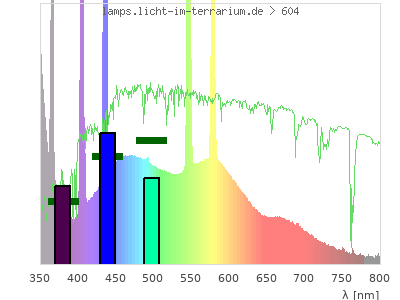 Whereas a spectrometer measures the intensity in every tiny wavelength interval resulting in thousands of individual intensities, the human eye only measures three intensities detected by the three cones. The same is true for the reptile eye with usually three or four photoreceptors. Effectively the detailled spectrum displayed above reduces to a much compacter bar graph displayed below. The photoreceptor sensitivites from these L-Cone, M-Cone, S-Cone, and U-Cone are used, they are chosen as an average of measured reptile photoreceptor sensitivity curves. The bar graph also shows as reference the intensity seen by the three or four photoreceptors for average sunlight (id 1).