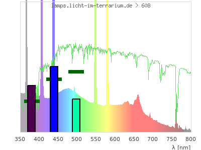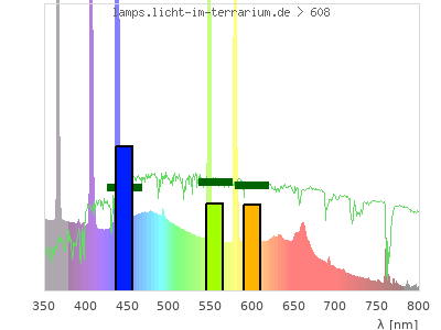 Whereas a spectrometer measures the intensity in every tiny wavelength interval resulting in thousands of individual intensities, the human eye only measures three intensities detected by the three cones. The same is true for the reptile eye with usually three or four photoreceptors. Effectively the detailled spectrum displayed above reduces to a much compacter bar graph displayed below. The photoreceptor sensitivites from these L-Cone, M-Cone, S-Cone, and U-Cone are used, they are chosen as an average of measured reptile photoreceptor sensitivity curves. The bar graph also shows as reference the intensity seen by the three or four photoreceptors for average sunlight (id 1).