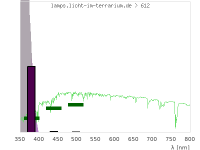 total ( 0 nm - 0 nm) 139 µW/cm² = 1.39 W/m² UVC ( 0 nm - 280 nm) 0 µW/cm² = 0 W/m² non-terrestrial ( 0 nm - 290 nm) 0 µW/cm² = 0 W/m² total2 ( 250 nm - 880 nm) 139 µW/cm² = 1.39 W/m² UVB (EU) ( 280 nm - 315 nm) 4.7 µW/cm² = 0.047 W/m² UVB (US) ( 280 nm - 320 nm) 8.51 µW/cm² = 0.0851 W/m² UVA+B ( 280 nm - 380 nm) 135 µW/cm² = 1.35 W/m² Solar UVB ( 290 nm - 315 nm) 4.69 µW/cm² = 0.0469 W/m² UVA D3 regulating ( 315 nm - 335 nm) 21.6 µW/cm² = 0.216 W/m² UVA (EU) ( 315 nm - 380 nm) 130 µW/cm² = 1.3 W/m² UVA2 (medical definition) ( 320 nm - 340 nm) 32.2 µW/cm² = 0.322 W/m² UVA (US) ( 320 nm - 380 nm) 126 µW/cm² = 1.26 W/m² UVA1 (variant) ( 335 nm - 380 nm) 108 µW/cm² = 1.08 W/m² UVA1 (medical) ( 340 nm - 400 nm) 98.2 µW/cm² = 0.982 W/m² vis. UVA ( 350 nm - 380 nm) 62.1 µW/cm² = 0.621 W/m² VIS Rep3 ( 350 nm - 600 nm) 66.4 µW/cm² = 0.664 W/m² VIS Rep4 ( 350 nm - 700 nm) 66.4 µW/cm² = 0.664 W/m² purple ( 380 nm - 420 nm) 4.3 µW/cm² = 0.043 W/m² VIS ( 380 nm - 780 nm) 4.3 µW/cm² = 0.043 W/m² VIS2 ( 400 nm - 680 nm) 0 µW/cm² = 0 W/m² PAR ( 400 nm - 700 nm) 0 µW/cm² = 0 W/m² tmp ( 400 nm - 1100 nm) 0 µW/cm² = 0 W/m² blue ( 420 nm - 490 nm) 0 µW/cm² = 0 W/m² green ( 490 nm - 575 nm) 0 µW/cm² = 0 W/m² yellow ( 575 nm - 585 nm) 0 µW/cm² = 0 W/m² orange ( 585 nm - 650 nm) 0 µW/cm² = 0 W/m² red ( 650 nm - 780 nm) 0 µW/cm² = 0 W/m² IRA ( 700 nm - 1400 nm) 0 µW/cm² = 0 W/m² IR2 ( 720 nm - 1100 nm) 0 µW/cm² = 0 W/m² IRB ( 1400 nm - 3000 nm) 0 µW/cm² = 0 W/m²