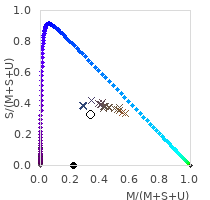 From these three numbers the colour coordinate and the correlated colour temperature for humans are calculated using the CIE standard method. I adapted this concept to a "3 cone reptile (M,S,U)" and a "4 cone reptile (L,M,S,U)". I am sure, that this adaption to other colour spaces makes sense mathematically and this is also done in scientific research regarding colour vision of animals, however I have not seen calculation of colour temperatures for other animals in the scientific literature. Even if it is hypothetical, at least this shows, how arbitrary the colour temperature is, and that the colour temperature calculated for humans does not apply to reptiles. The colour spaces also show the colour coordinates of different phases of daylight ((ids 1, 338 – 451, 511 – 513 ), indicated by crosses, coloured in the appriximate colour perceived by a human.