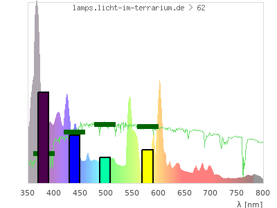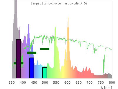Whereas a spectrometer measures the intensity in every tiny wavelength interval resulting in thousands of individual intensities, the human eye only measures three intensities detected by the three cones. The same is true for the reptile eye with usually three or four photoreceptors. Effectively the detailled spectrum displayed above reduces to a much compacter bar graph displayed below. The photoreceptor sensitivites from these L-Cone, M-Cone, S-Cone, and U-Cone are used, they are chosen as an average of measured reptile photoreceptor sensitivity curves. The bar graph also shows as reference the intensity seen by the three or four photoreceptors for average sunlight (id 1).