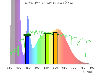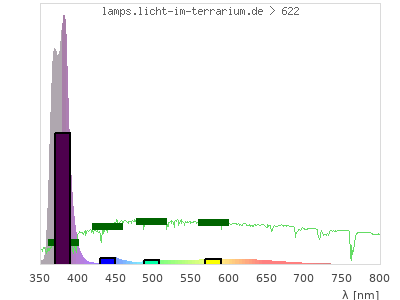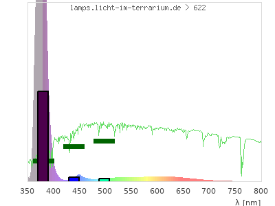 Whereas a spectrometer measures the intensity in every tiny wavelength interval resulting in thousands of individual intensities, the human eye only measures three intensities detected by the three cones. The same is true for the reptile eye with usually three or four photoreceptors. Effectively the detailled spectrum displayed above reduces to a much compacter bar graph displayed below. The photoreceptor sensitivites from these L-Cone, M-Cone, S-Cone, and U-Cone are used, they are chosen as an average of measured reptile photoreceptor sensitivity curves. The bar graph also shows as reference the intensity seen by the three or four photoreceptors for average sunlight (id 1).