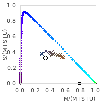 From these three numbers the colour coordinate and the correlated colour temperature for humans are calculated using the CIE standard method. I adapted this concept to a "3 cone reptile (M,S,U)" and a "4 cone reptile (L,M,S,U)". I am sure, that this adaption to other colour spaces makes sense mathematically and this is also done in scientific research regarding colour vision of animals, however I have not seen calculation of colour temperatures for other animals in the scientific literature. Even if it is hypothetical, at least this shows, how arbitrary the colour temperature is, and that the colour temperature calculated for humans does not apply to reptiles. The colour spaces also show the colour coordinates of different phases of daylight ((ids 1, 338 – 451, 511 – 513 ), indicated by crosses, coloured in the appriximate colour perceived by a human.