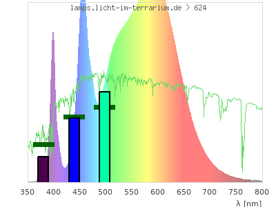 Erythema 66.1 UV-Index Pyrimidine dimerization of DNA 20.3 µW/cm² Photoceratitis 86.3 µW/cm² Photoconjunctivitis 66.9 µW/cm² DNA Damage 99.1 Vitamin D3 92.7 µW/cm² Photosynthesis 1140 µW/cm² Luminosity 6200 lx Human L-Cone 942 µW/cm² Human M-Cone 742 µW/cm² Human S-Cone 279 µW/cm² CIE X 841 µW/cm² CIE Y 866 µW/cm² CIE Z 548 µW/cm² PAR PPFD 83.2 µmol/m²/s Extinction preD3 1060 e-3*m²/mol Extinction Tachysterol 3270 e-3*m²/mol Exctincition PreD3 938000 m²/mol Extinction Lumisterol 1110 m²/mol Exctincition Tachysterol 4140000 m²/mol Extinction 7DHC 1430 m²/mol L-Cone 819 µW/cm² M-Cone 609 µW/cm² S-Cone 433 µW/cm² U-Cone 171 µW/cm² UVR - ICNIRP 2004 135 Rel Biol Eff Melatonin Supression 437 µW/cm² Blue Light Hazard 299 µW/cm² (48.2 µW/cm² per 1000 lx) CIE 174:2006 PreVit D3 90.4 µW/cm² Lumen Reptil 5100 "pseudo-lx" Vitamin D3 Degradation 95.4 µW/cm² Actinic UV 135 µW/cm² (217 mW/klm) Exctincition Lumisterol 1260000 m²/mol Exctincition 7DHC 1560000 m²/mol Exctincition Toxisterols 146000 m²/mol
