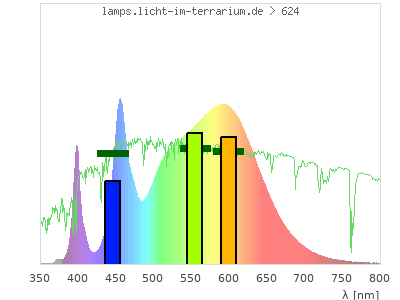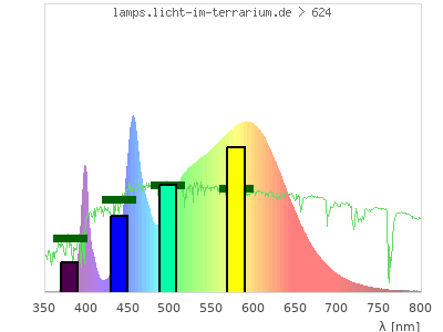 Whereas a spectrometer measures the intensity in every tiny wavelength interval resulting in thousands of individual intensities, the human eye only measures three intensities detected by the three cones. The same is true for the reptile eye with usually three or four photoreceptors. Effectively the detailled spectrum displayed above reduces to a much compacter bar graph displayed below. The photoreceptor sensitivites from these L-Cone, M-Cone, S-Cone, and U-Cone are used, they are chosen as an average of measured reptile photoreceptor sensitivity curves. The bar graph also shows as reference the intensity seen by the three or four photoreceptors for average sunlight (id 1).