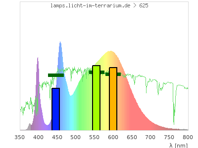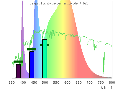 Whereas a spectrometer measures the intensity in every tiny wavelength interval resulting in thousands of individual intensities, the human eye only measures three intensities detected by the three cones. The same is true for the reptile eye with usually three or four photoreceptors. Effectively the detailled spectrum displayed above reduces to a much compacter bar graph displayed below. The photoreceptor sensitivites from these L-Cone, M-Cone, S-Cone, and U-Cone are used, they are chosen as an average of measured reptile photoreceptor sensitivity curves. The bar graph also shows as reference the intensity seen by the three or four photoreceptors for average sunlight (id 1).