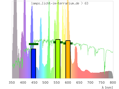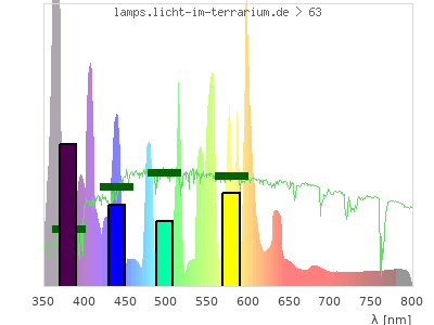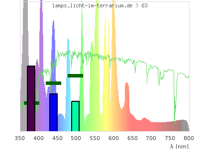 Whereas a spectrometer measures the intensity in every tiny wavelength interval resulting in thousands of individual intensities, the human eye only measures three intensities detected by the three cones. The same is true for the reptile eye with usually three or four photoreceptors. Effectively the detailled spectrum displayed above reduces to a much compacter bar graph displayed below. The photoreceptor sensitivites from these L-Cone, M-Cone, S-Cone, and U-Cone are used, they are chosen as an average of measured reptile photoreceptor sensitivity curves. The bar graph also shows as reference the intensity seen by the three or four photoreceptors for average sunlight (id 1).