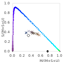 From these three numbers the colour coordinate and the correlated colour temperature for humans are calculated using the CIE standard method. I adapted this concept to a "3 cone reptile (M,S,U)" and a "4 cone reptile (L,M,S,U)". I am sure, that this adaption to other colour spaces makes sense mathematically and this is also done in scientific research regarding colour vision of animals, however I have not seen calculation of colour temperatures for other animals in the scientific literature. Even if it is hypothetical, at least this shows, how arbitrary the colour temperature is, and that the colour temperature calculated for humans does not apply to reptiles. The colour spaces also show the colour coordinates of different phases of daylight ((ids 1, 338 – 451, 511 – 513 ), indicated by crosses, coloured in the appriximate colour perceived by a human.