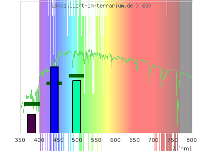 Whereas a spectrometer measures the intensity in every tiny wavelength interval resulting in thousands of individual intensities, the human eye only measures three intensities detected by the three cones. The same is true for the reptile eye with usually three or four photoreceptors. Effectively the detailled spectrum displayed above reduces to a much compacter bar graph displayed below. The photoreceptor sensitivites from these L-Cone, M-Cone, S-Cone, and U-Cone are used, they are chosen as an average of measured reptile photoreceptor sensitivity curves. The bar graph also shows as reference the intensity seen by the three or four photoreceptors for average sunlight (id 1).