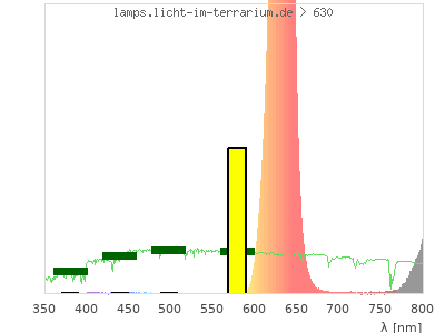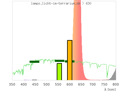 total ( 0 nm - 0 nm) 4600 µW/cm² = 46 W/m² UVC ( 0 nm - 280 nm) 0 µW/cm² = 0 W/m² non-terrestrial ( 0 nm - 290 nm) 0 µW/cm² = 0 W/m² total2 ( 250 nm - 880 nm) 4590 µW/cm² = 45.9 W/m² UVB (EU) ( 280 nm - 315 nm) 0 µW/cm² = 0 W/m² UVB (US) ( 280 nm - 320 nm) 0 µW/cm² = 0 W/m² UVA+B ( 280 nm - 380 nm) 0 µW/cm² = 0 W/m² Solar UVB ( 290 nm - 315 nm) 0 µW/cm² = 0 W/m² UVA D3 regulating ( 315 nm - 335 nm) 0 µW/cm² = 0 W/m² UVA (EU) ( 315 nm - 380 nm) 0 µW/cm² = 0 W/m² UVA2 (medical definition) ( 320 nm - 340 nm) 0 µW/cm² = 0 W/m² UVA (US) ( 320 nm - 380 nm) 0 µW/cm² = 0 W/m² UVA1 (variant) ( 335 nm - 380 nm) 0 µW/cm² = 0 W/m² UVA1 (medical) ( 340 nm - 400 nm) 0 µW/cm² = 0 W/m² vis. UVA ( 350 nm - 380 nm) 0 µW/cm² = 0 W/m² VIS Rep3 ( 350 nm - 600 nm) 15.1 µW/cm² = 0.151 W/m² VIS Rep4 ( 350 nm - 700 nm) 2350 µW/cm² = 23.5 W/m² purple ( 380 nm - 420 nm) 0.682 µW/cm² = 0.00682 W/m² VIS ( 380 nm - 780 nm) 2360 µW/cm² = 23.6 W/m² VIS2 ( 400 nm - 680 nm) 2350 µW/cm² = 23.5 W/m² PAR ( 400 nm - 700 nm) 2350 µW/cm² = 23.5 W/m² tmp ( 400 nm - 1100 nm) 4600 µW/cm² = 46 W/m² blue ( 420 nm - 490 nm) 1.51 µW/cm² = 0.0151 W/m² green ( 490 nm - 575 nm) 1.17 µW/cm² = 0.0117 W/m² yellow ( 575 nm - 585 nm) 0.361 µW/cm² = 0.00361 W/m² orange ( 585 nm - 650 nm) 2270 µW/cm² = 22.7 W/m² red ( 650 nm - 780 nm) 90.2 µW/cm² = 0.902 W/m² IRA ( 700 nm - 1400 nm) 2250 µW/cm² = 22.5 W/m² IR2 ( 720 nm - 1100 nm) 2250 µW/cm² = 22.5 W/m² IRB ( 1400 nm - 3000 nm) 0 µW/cm² = 0 W/m²