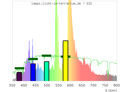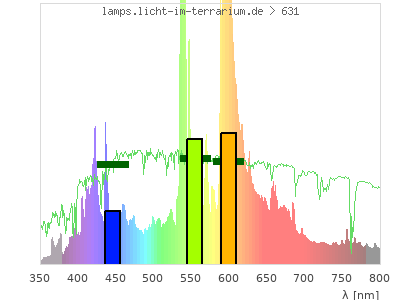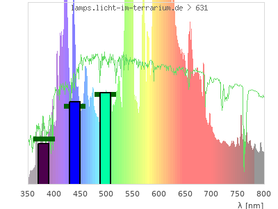 Whereas a spectrometer measures the intensity in every tiny wavelength interval resulting in thousands of individual intensities, the human eye only measures three intensities detected by the three cones. The same is true for the reptile eye with usually three or four photoreceptors. Effectively the detailled spectrum displayed above reduces to a much compacter bar graph displayed below. The photoreceptor sensitivites from these L-Cone, M-Cone, S-Cone, and U-Cone are used, they are chosen as an average of measured reptile photoreceptor sensitivity curves. The bar graph also shows as reference the intensity seen by the three or four photoreceptors for average sunlight (id 1).