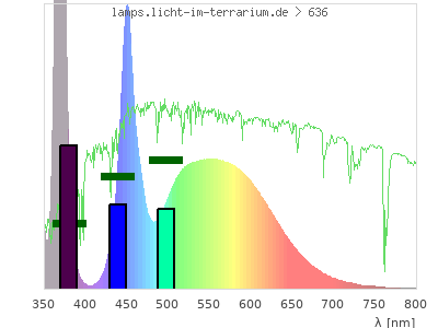 Whereas a spectrometer measures the intensity in every tiny wavelength interval resulting in thousands of individual intensities, the human eye only measures three intensities detected by the three cones. The same is true for the reptile eye with usually three or four photoreceptors. Effectively the detailled spectrum displayed above reduces to a much compacter bar graph displayed below. The photoreceptor sensitivites from these L-Cone, M-Cone, S-Cone, and U-Cone are used, they are chosen as an average of measured reptile photoreceptor sensitivity curves. The bar graph also shows as reference the intensity seen by the three or four photoreceptors for average sunlight (id 1).