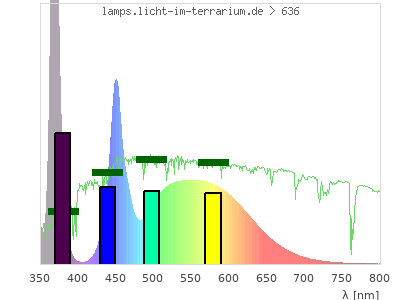 total ( 0 nm - 0 nm) 596 µW/cm² = 5.96 W/m² UVC ( 0 nm - 280 nm) 0 µW/cm² = 0 W/m² non-terrestrial ( 0 nm - 290 nm) 0 µW/cm² = 0 W/m² total2 ( 250 nm - 880 nm) 595 µW/cm² = 5.95 W/m² UVB (EU) ( 280 nm - 315 nm) 41.1 µW/cm² = 0.411 W/m² UVB (US) ( 280 nm - 320 nm) 46.7 µW/cm² = 0.467 W/m² UVA+B ( 280 nm - 380 nm) 227 µW/cm² = 2.27 W/m² Solar UVB ( 290 nm - 315 nm) 41.1 µW/cm² = 0.411 W/m² UVA D3 regulating ( 315 nm - 335 nm) 14.8 µW/cm² = 0.148 W/m² UVA (EU) ( 315 nm - 380 nm) 186 µW/cm² = 1.86 W/m² UVA2 (medical definition) ( 320 nm - 340 nm) 21.1 µW/cm² = 0.211 W/m² UVA (US) ( 320 nm - 380 nm) 180 µW/cm² = 1.8 W/m² UVA1 (variant) ( 335 nm - 380 nm) 171 µW/cm² = 1.71 W/m² UVA1 (medical) ( 340 nm - 400 nm) 168 µW/cm² = 1.68 W/m² vis. UVA ( 350 nm - 380 nm) 135 µW/cm² = 1.35 W/m² VIS Rep3 ( 350 nm - 600 nm) 430 µW/cm² = 4.3 W/m² VIS Rep4 ( 350 nm - 700 nm) 496 µW/cm² = 4.96 W/m² purple ( 380 nm - 420 nm) 10.5 µW/cm² = 0.105 W/m² VIS ( 380 nm - 780 nm) 366 µW/cm² = 3.66 W/m² VIS2 ( 400 nm - 680 nm) 349 µW/cm² = 3.49 W/m² PAR ( 400 nm - 700 nm) 353 µW/cm² = 3.53 W/m² tmp ( 400 nm - 1100 nm) 360 µW/cm² = 3.6 W/m² blue ( 420 nm - 490 nm) 113 µW/cm² = 1.13 W/m² green ( 490 nm - 575 nm) 133 µW/cm² = 1.33 W/m² yellow ( 575 nm - 585 nm) 16.4 µW/cm² = 0.164 W/m² orange ( 585 nm - 650 nm) 73 µW/cm² = 0.73 W/m² red ( 650 nm - 780 nm) 20.5 µW/cm² = 0.205 W/m² IRA ( 700 nm - 1400 nm) 7.24 µW/cm² = 0.0724 W/m² IR2 ( 720 nm - 1100 nm) 5.12 µW/cm² = 0.0512 W/m² IRB ( 1400 nm - 3000 nm) 0 µW/cm² = 0 W/m²