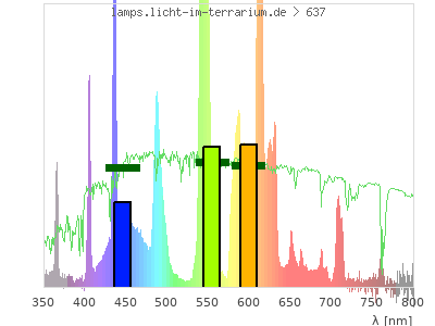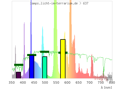 Whereas a spectrometer measures the intensity in every tiny wavelength interval resulting in thousands of individual intensities, the human eye only measures three intensities detected by the three cones. The same is true for the reptile eye with usually three or four photoreceptors. Effectively the detailled spectrum displayed above reduces to a much compacter bar graph displayed below. The photoreceptor sensitivites from these L-Cone, M-Cone, S-Cone, and U-Cone are used, they are chosen as an average of measured reptile photoreceptor sensitivity curves. The bar graph also shows as reference the intensity seen by the three or four photoreceptors for average sunlight (id 1).