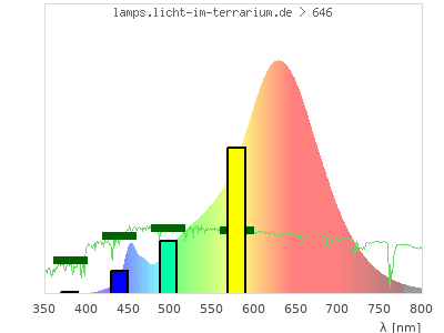 Whereas a spectrometer measures the intensity in every tiny wavelength interval resulting in thousands of individual intensities, the human eye only measures three intensities detected by the three cones. The same is true for the reptile eye with usually three or four photoreceptors. Effectively the detailled spectrum displayed above reduces to a much compacter bar graph displayed below. The photoreceptor sensitivites from these L-Cone, M-Cone, S-Cone, and U-Cone are used, they are chosen as an average of measured reptile photoreceptor sensitivity curves. The bar graph also shows as reference the intensity seen by the three or four photoreceptors for average sunlight (id 1).