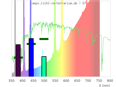 Erythema 0.756 UV-Index Pyrimidine dimerization of DNA 5.8 µW/cm² Photoceratitis 1.32 µW/cm² Photoconjunctivitis 0.0606 µW/cm² DNA Damage 0.144 Vitamin D3 3.15 µW/cm² Photosynthesis 535 µW/cm² Luminosity 2640 lx Human L-Cone 401 µW/cm² Human M-Cone 316 µW/cm² Human S-Cone 115 µW/cm² CIE X 357 µW/cm² CIE Y 373 µW/cm² CIE Z 205 µW/cm² PAR PPFD 41 µmol/m²/s Extinction preD3 17.5 e-3*m²/mol Extinction Tachysterol 59.2 e-3*m²/mol Exctincition PreD3 8270 m²/mol Extinction Lumisterol 3.99 m²/mol Exctincition Tachysterol 77200 m²/mol Extinction 7DHC 4.05 m²/mol L-Cone 359 µW/cm² M-Cone 122 µW/cm² S-Cone 233 µW/cm² U-Cone 196 µW/cm² UVR - ICNIRP 2004 0.729 Rel Biol Eff Melatonin Supression 140 µW/cm² Blue Light Hazard 133 µW/cm² (50.5 µW/cm² per 1000 lx) CIE 174:2006 PreVit D3 3.26 µW/cm² Lumen Reptil 2170 "pseudo-lx" Vitamin D3 Degradation 2.83 µW/cm² Actinic UV 0.704 µW/cm² (2.66 mW/klm) Exctincition Lumisterol 5280 m²/mol Exctincition 7DHC 5210 m²/mol Exctincition Toxisterols 1030 m²/mol