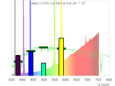 Whereas a spectrometer measures the intensity in every tiny wavelength interval resulting in thousands of individual intensities, the human eye only measures three intensities detected by the three cones. The same is true for the reptile eye with usually three or four photoreceptors. Effectively the detailled spectrum displayed above reduces to a much compacter bar graph displayed below. The photoreceptor sensitivites from these L-Cone, M-Cone, S-Cone, and U-Cone are used, they are chosen as an average of measured reptile photoreceptor sensitivity curves. The bar graph also shows as reference the intensity seen by the three or four photoreceptors for average sunlight (id 1).