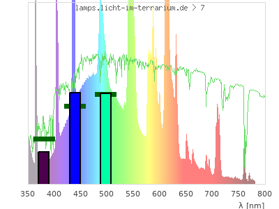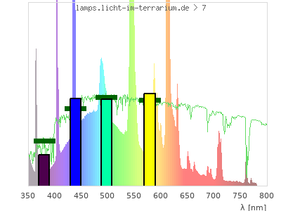 Whereas a spectrometer measures the intensity in every tiny wavelength interval resulting in thousands of individual intensities, the human eye only measures three intensities detected by the three cones. The same is true for the reptile eye with usually three or four photoreceptors. Effectively the detailled spectrum displayed above reduces to a much compacter bar graph displayed below. The photoreceptor sensitivites from these L-Cone, M-Cone, S-Cone, and U-Cone are used, they are chosen as an average of measured reptile photoreceptor sensitivity curves. The bar graph also shows as reference the intensity seen by the three or four photoreceptors for average sunlight (id 1).