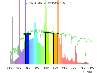 total ( 0 nm - 0 nm) 700 µW/cm² = 7 W/m² UVC ( 0 nm - 280 nm) 0.931 µW/cm² = 0.00931 W/m² non-terrestrial ( 0 nm - 290 nm) 1.13 µW/cm² = 0.0113 W/m² total2 ( 250 nm - 880 nm) 700 µW/cm² = 7 W/m² UVB (EU) ( 280 nm - 315 nm) 8.52 µW/cm² = 0.0852 W/m² UVB (US) ( 280 nm - 320 nm) 14.1 µW/cm² = 0.141 W/m² UVA+B ( 280 nm - 380 nm) 73.2 µW/cm² = 0.732 W/m² Solar UVB ( 290 nm - 315 nm) 8.32 µW/cm² = 0.0832 W/m² UVA D3 regulating ( 315 nm - 335 nm) 24.8 µW/cm² = 0.248 W/m² UVA (EU) ( 315 nm - 380 nm) 64.6 µW/cm² = 0.646 W/m² UVA2 (medical definition) ( 320 nm - 340 nm) 26.8 µW/cm² = 0.268 W/m² UVA (US) ( 320 nm - 380 nm) 59.1 µW/cm² = 0.591 W/m² UVA1 (variant) ( 335 nm - 380 nm) 39.8 µW/cm² = 0.398 W/m² UVA1 (medical) ( 340 nm - 400 nm) 41.3 µW/cm² = 0.413 W/m² vis. UVA ( 350 nm - 380 nm) 20.1 µW/cm² = 0.201 W/m² VIS Rep3 ( 350 nm - 600 nm) 483 µW/cm² = 4.83 W/m² VIS Rep4 ( 350 nm - 700 nm) 627 µW/cm² = 6.27 W/m² purple ( 380 nm - 420 nm) 40.6 µW/cm² = 0.406 W/m² VIS ( 380 nm - 780 nm) 626 µW/cm² = 6.26 W/m² VIS2 ( 400 nm - 680 nm) 592 µW/cm² = 5.92 W/m² PAR ( 400 nm - 700 nm) 598 µW/cm² = 5.98 W/m² tmp ( 400 nm - 1100 nm) 617 µW/cm² = 6.17 W/m² blue ( 420 nm - 490 nm) 167 µW/cm² = 1.67 W/m² green ( 490 nm - 575 nm) 202 µW/cm² = 2.02 W/m² yellow ( 575 nm - 585 nm) 22.1 µW/cm² = 0.221 W/m² orange ( 585 nm - 650 nm) 156 µW/cm² = 1.56 W/m² red ( 650 nm - 780 nm) 37.8 µW/cm² = 0.378 W/m² IRA ( 700 nm - 1400 nm) 19 µW/cm² = 0.19 W/m² IR2 ( 720 nm - 1100 nm) 7.39 µW/cm² = 0.0739 W/m² IRB ( 1400 nm - 3000 nm) 0 µW/cm² = 0 W/m²