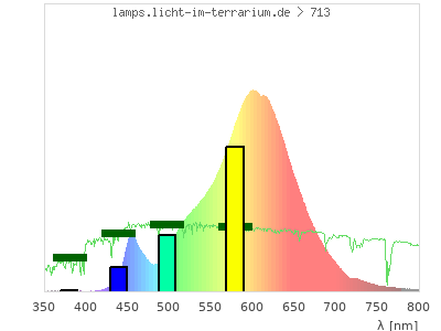 Whereas a spectrometer measures the intensity in every tiny wavelength interval resulting in thousands of individual intensities, the human eye only measures three intensities detected by the three cones. The same is true for the reptile eye with usually three or four photoreceptors. Effectively the detailled spectrum displayed above reduces to a much compacter bar graph displayed below. The photoreceptor sensitivites from these L-Cone, M-Cone, S-Cone, and U-Cone are used, they are chosen as an average of measured reptile photoreceptor sensitivity curves. The bar graph also shows as reference the intensity seen by the three or four photoreceptors for average sunlight (id 1).