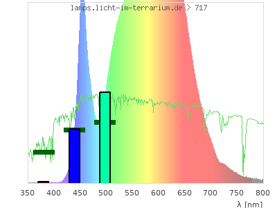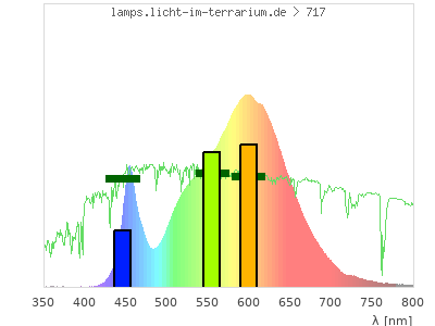 Erythema 0.0931 UV-Index Pyrimidine dimerization of DNA 0.847 µW/cm² Photoceratitis 0.142 µW/cm² Photoconjunctivitis 0.00246 µW/cm² DNA Damage 0.00802 Vitamin D3 0.468 µW/cm² Photosynthesis 2410 µW/cm² Luminosity 13700 lx Human L-Cone 2140 µW/cm² Human M-Cone 1540 µW/cm² Human S-Cone 405 µW/cm² CIE X 2020 µW/cm² CIE Y 1910 µW/cm² CIE Z 807 µW/cm² PAR PPFD 181 µmol/m²/s Extinction preD3 2.04 e-3*m²/mol Extinction Tachysterol 6.8 e-3*m²/mol Exctincition PreD3 922 m²/mol Extinction Lumisterol 0.413 m²/mol Exctincition Tachysterol 8970 m²/mol Extinction 7DHC 0.251 m²/mol L-Cone 1940 µW/cm² M-Cone 1000 µW/cm² S-Cone 597 µW/cm² U-Cone 11.9 µW/cm² UVR - ICNIRP 2004 0.0786 Rel Biol Eff Melatonin Supression 630 µW/cm² Blue Light Hazard 424 µW/cm² (30.8 µW/cm² per 1000 lx) CIE 174:2006 PreVit D3 0.534 µW/cm² Lumen Reptil 9580 "pseudo-lx" Vitamin D3 Degradation 0.323 µW/cm² Actinic UV 0.0754 µW/cm² (0.0549 mW/klm) Exctincition Lumisterol 559 m²/mol Exctincition 7DHC 327 m²/mol Exctincition Toxisterols 122 m²/mol